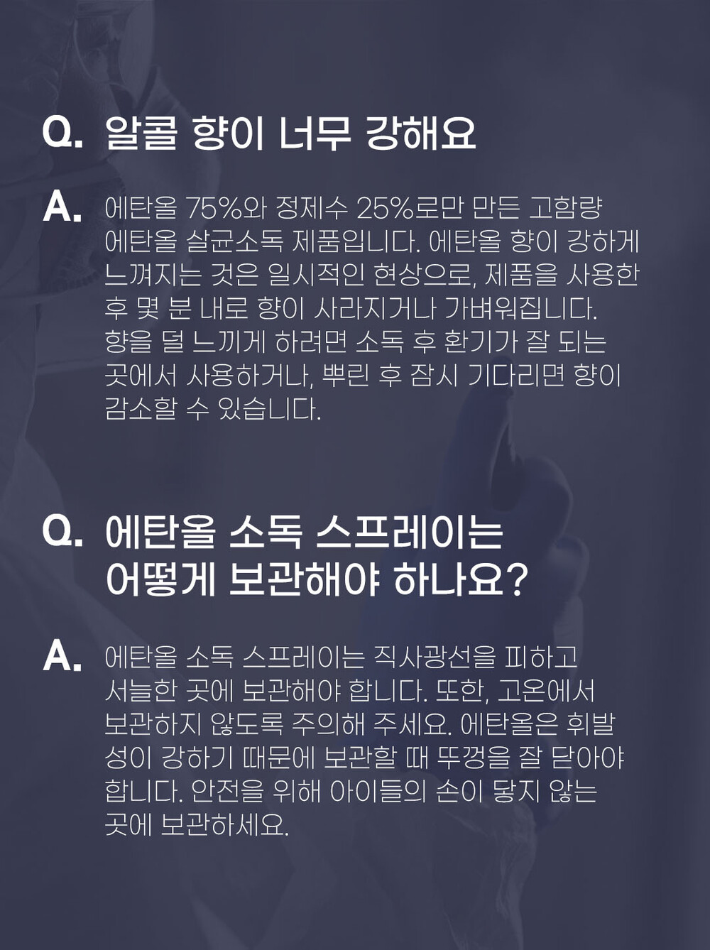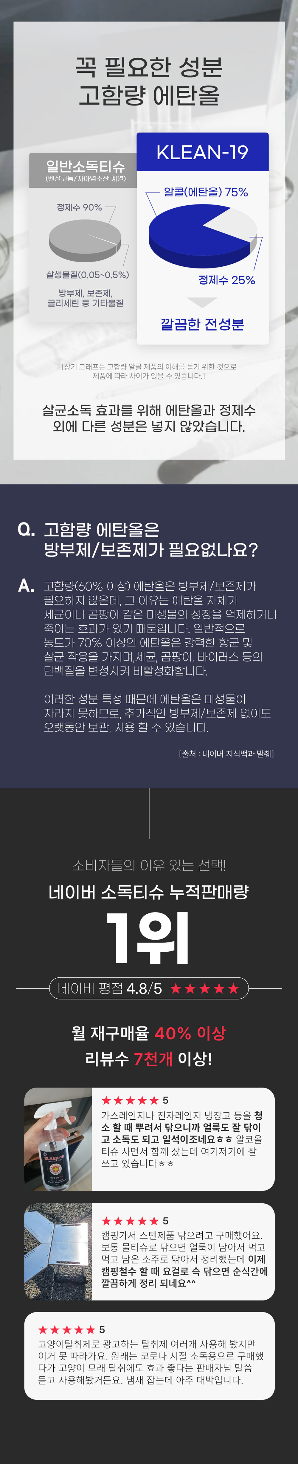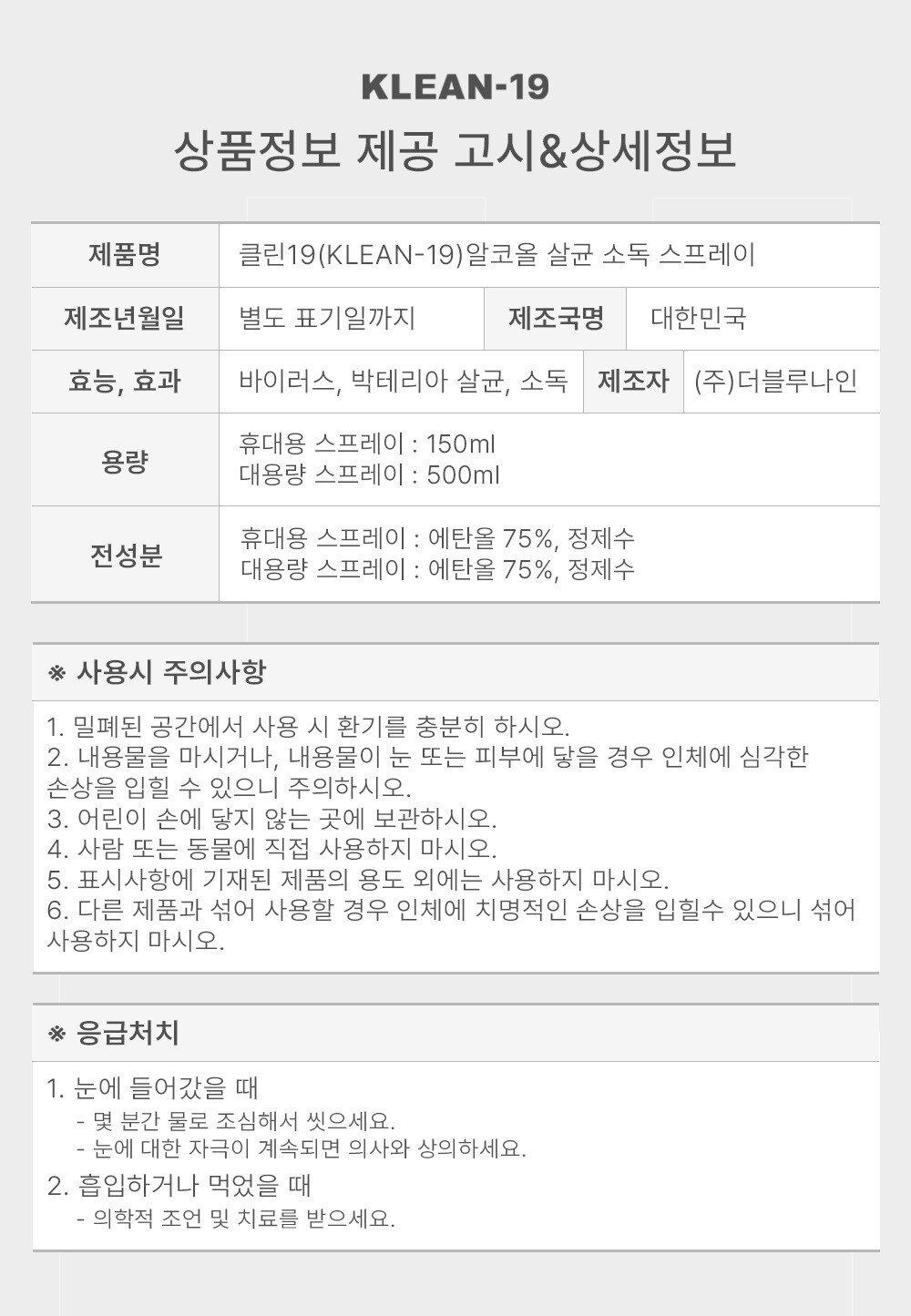 에탄올 75%와 정제수로만 만든 제품으로 각종 세균과 바이러스 99.999% 살균 효과 및 찌든때/기름때 제거에도 탁월한 효과가 있습니다.
